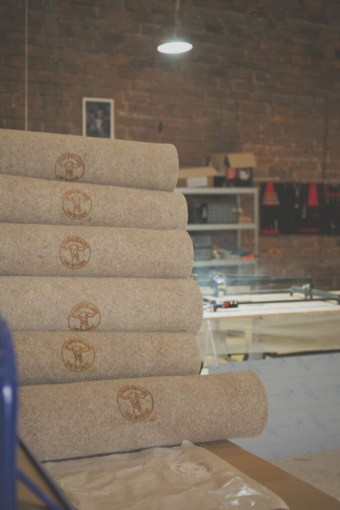 Le cœur de l’activité, aujourd’hui, c’est le tapis de yoga. En fait, le point de départ a été assez concret : on est partis de l’outil de production disponible localement. Depuis 2023, il y a une filature qui a rouvert dans le sud de l’Aveyron, et c’est à partir de ses capacités de transformation que j’ai réfléchi aux produits qu’on pouvait développer. En travaillant avec eux, on a réussi à mettre au point un feutre de laine assez particulier : environ un centimètre d’épaisseur, très dense, avec à peu près un kilo de laine par mètre carré. Cela donne un matériau à la fois solide et durable. Mais au-delà de l’aspect technique, il y a aussi une logique liée à la matière. Historiquement, la laine issue des brebis de l’AOP Roquefort était utilisée pour la literie, notamment pour ses propriétés de rebond. C’est une laine qui a une vraie élasticité naturelle. C’est cette qualité qu’on est allé chercher. Dans le yoga, comme dans beaucoup de pratiques sportives, les articulations sont très sollicitées, et c’est souvent là que se créent des points de tension ou d’inconfort. L’idée a donc été de s’appuyer sur les qualités naturelles de la laine pour répondre à un besoin très concret : améliorer le confort articulaire, grâce à un matériau à la fois dense, souple et résilient.